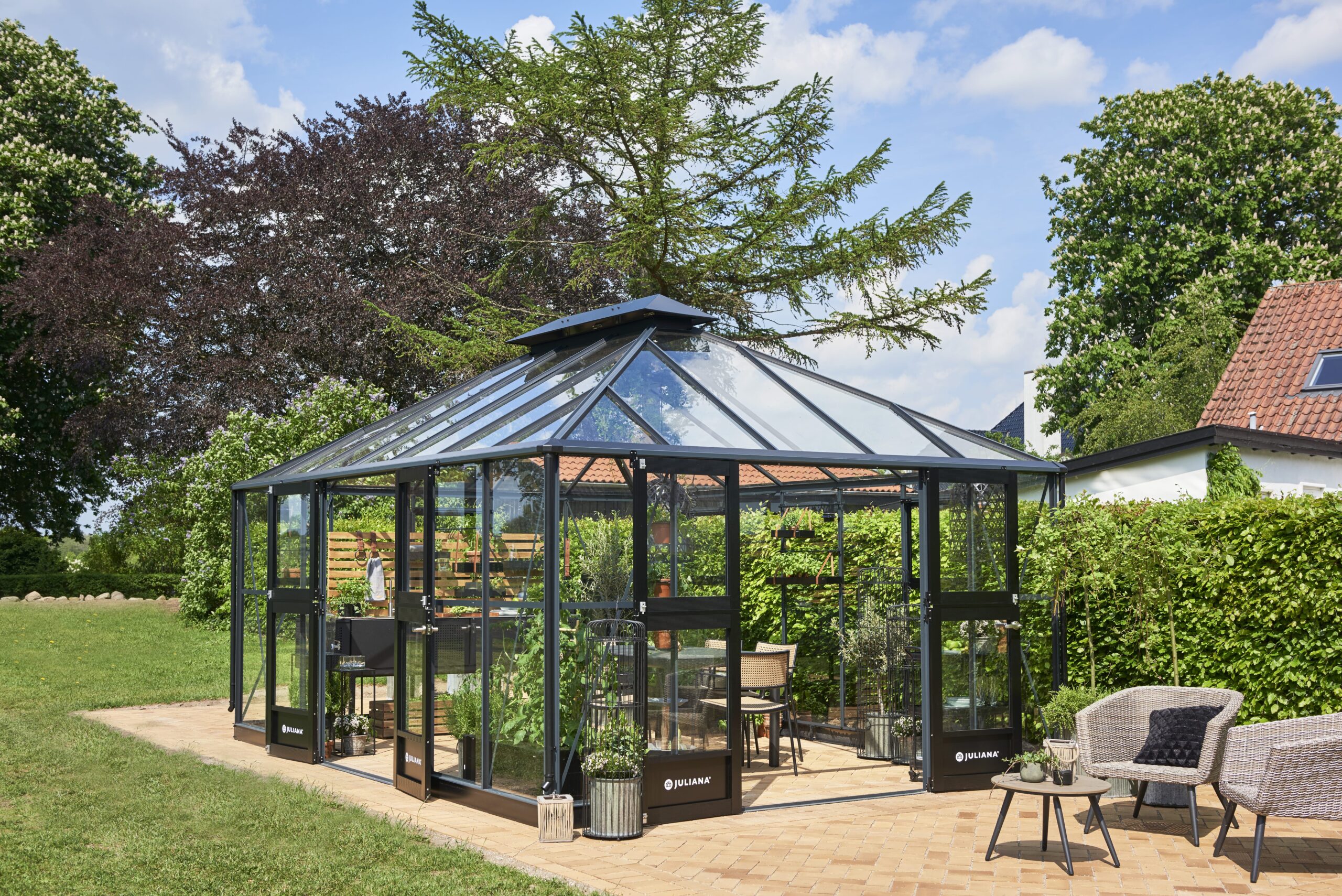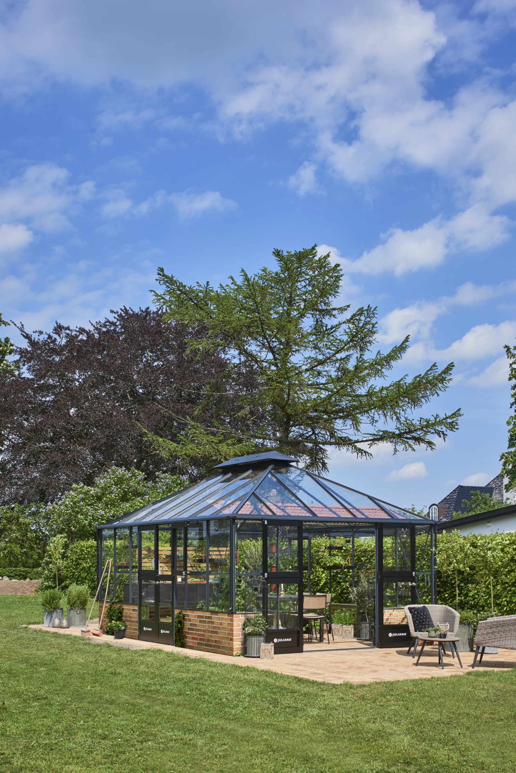 Extra dubbele staldeuren voor in de tuinkamer Grand Oase 13,0 antracietgrijs. Alleen te plaasten in een zijgevel van 439 cm breed welke 6 secties (6 ruiten) breed is! Het pakket bestaat uit 2 zwart gecoate deuren met ruiten, 1 deur kozijn en aluminium zijgevel profielen in de kleur antracietgrijs.