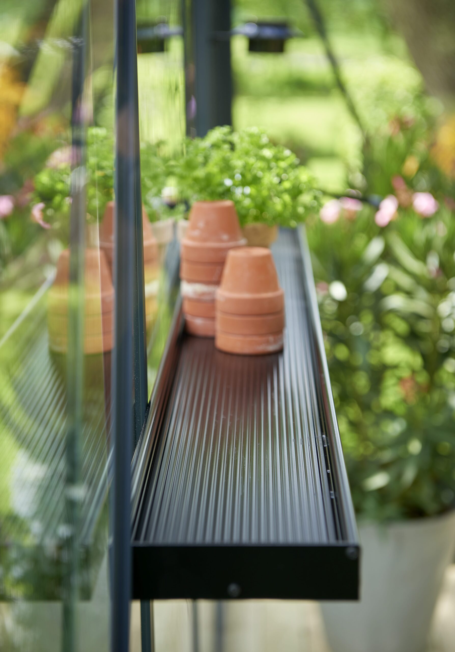 Deze zwart gecoate kweekgoot is verkrijgbaar in 2 maatvoeringen en wordt gekenmerkt door een luxe uitstraling en afwerking. De goot heeft een vaste breedtemaat van 14 cm, met een hoogte van 5 cm. De lengte bedraagt voor dit model 213 cm. De goot wordt in de kas bevestigd aan een zijgevel, waarbij het profiel geschikt moet zijn voor een standaard (hamerkop)bout, maatvoering M6x10. Het geheel wordt ondersteund door diagonale dragers en is in hoogte instelbaar. Deze goot bestaat uit een zwart gecoate aluminium constructie en is waterdicht door twee rubbermembramen. Door het vullen van de goot met water is er voor alle planten (in pot) direct water beschikbaar!