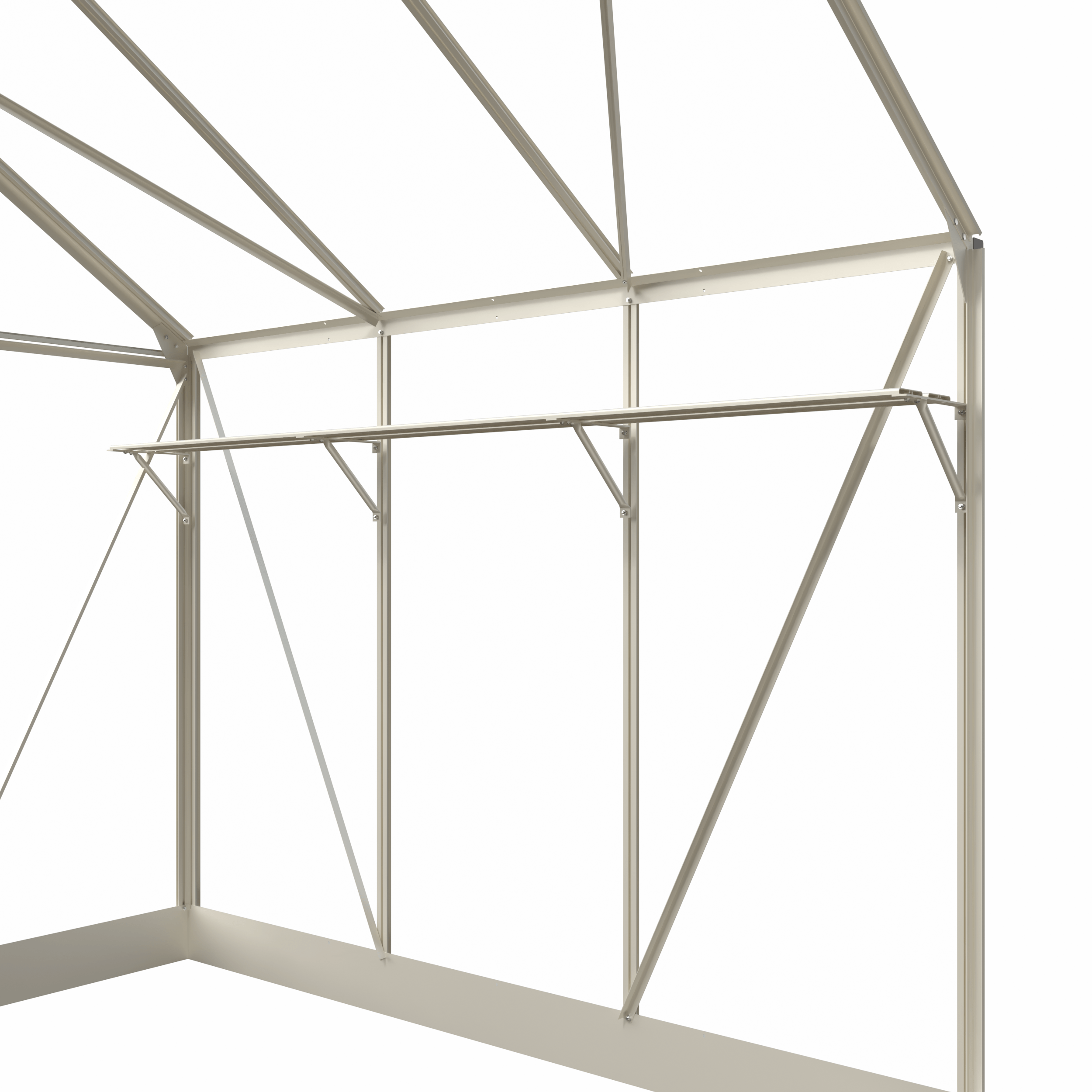 Maak optimaal gebruik van de ruimte in je kas. Een kweekschap creëert ruimte in je kas voor kweekpotjes, snoeischaar, bolletje touw, zakjes zaadjes en alle andere kleinere kweekbenodigdheden. Je kunt er zaadjes opkweken of jonge plantjes laten groeien. De constructie bestaat uit 2 leggers, dragers en schoren. Een solide verbinding met het kasframe wordt gemaakt met behulp van (hamerkop)bouten en moeren, standaardmaat M6. De hoogte bepaal je zelf doordat het schap instelbaar is. Het kweekschap is 22,5 cm diep en is bijpassend bij iedere kasmaat zodat de binnenmaat (diepte) van de kas netjes uitgevuld wordt.