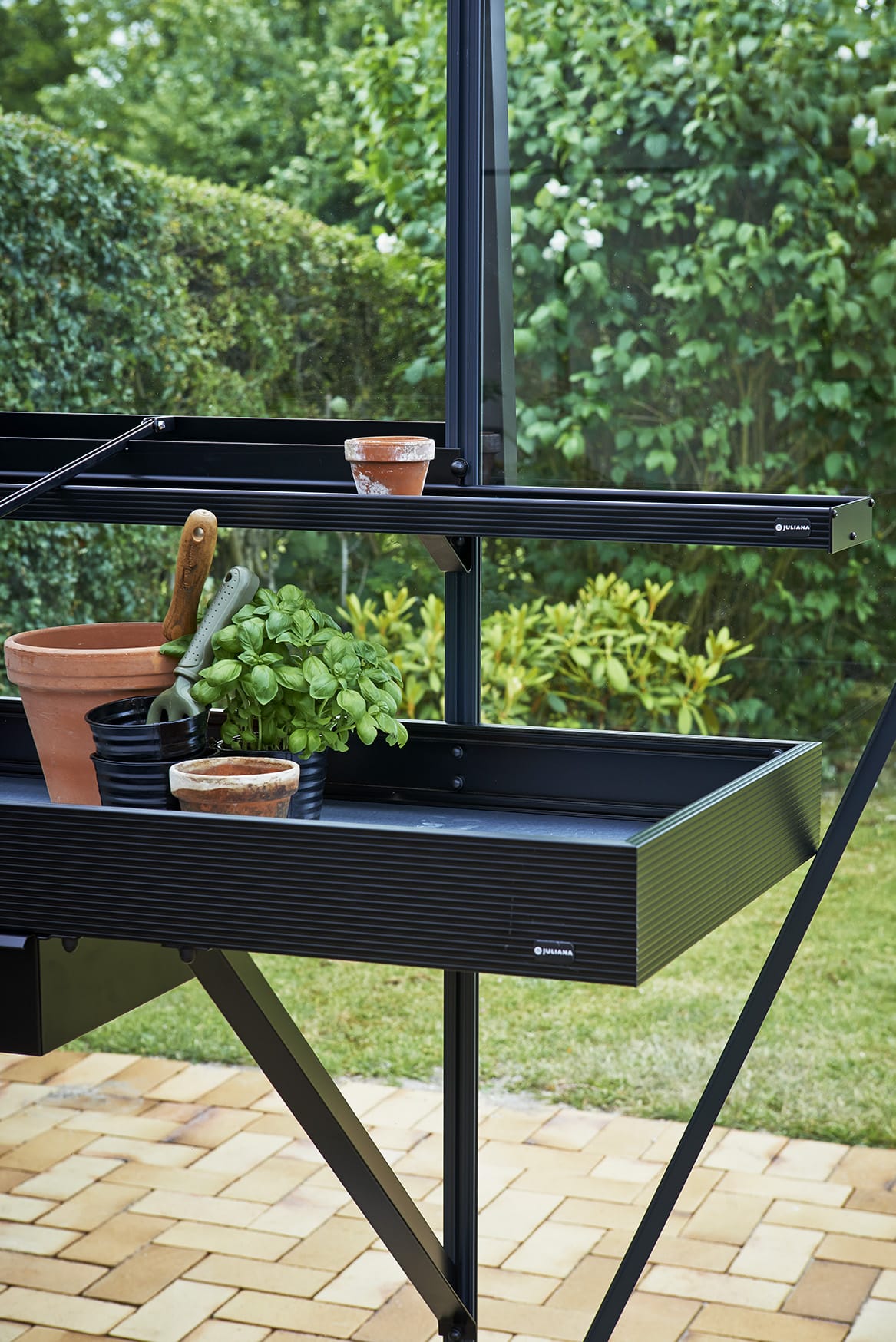 Deze zwart gecoate kweektafel is verkrijgbaar in 2 maatvoeringen en wordt gekenmerkt door een luxe uitstraling en afwerking. Handig is de lade die voldoende ruimte biedt voor diverse kweekbenodigdheden of – gereedschappen. De tafel heeft een vaste breedtemaat van 50 cm, met een hoogte van 10 cm. De lengte bedraagt voor dit model 141 cm. De tafel wordt in de kas bevestigd aan een zijgevel, waarbij het profiel geschikt moet zijn voor een standaard (hamerkop)bout, maatvoering M6x10. Het geheel wordt ondersteund door diagonale dragers en is in hoogte instelbaar voor een optimale werkhouding. Deze solide kweektafel bestaat uit een aluminium constructie, afgewerkt met een zwarte poedercoating voor een luxueuze uitstraling.