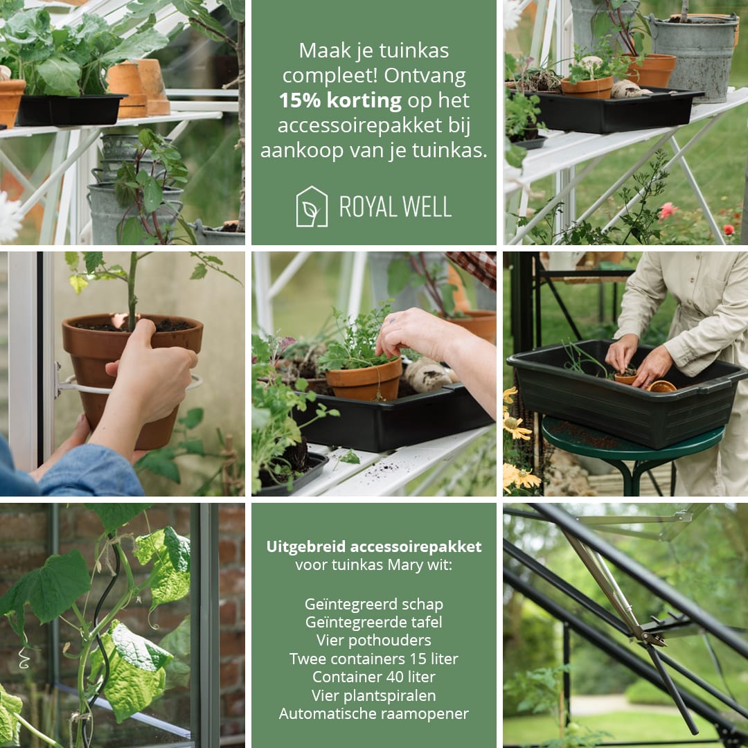 Met een Full Options pakket heb je alles in huis om een prachtige oogst te verkrijgen. Met een geïntegreerd schap, tafel, 4 pothouders in de kleur van de kas, containers (2x 15 liter en 1x 40 liter), 4 zwarte tomatenspiralen en automatische raamopener heb je alle accessoires om direct in tuinkas Mary van start te gaan. Ideaal! Daarnaast ontvang je bij aankoop van een kas in combinatie met een full option pakket 15% korting op de accessoires in het pakket. Tuinkas Mary van Royal Well is een elegante kas die niet alleen genoeg ruimte biedt om te kweken, maar ook om te ontspannen. Dit model met puntdak en schuifdeur met haakslot combineert functionaliteit met stijl. Het 3 mm dikke veiligheidsglas wordt bevestigd met dempend foamtape aan de binnenzijde en PVC beglazingstrips aan de buitenzijde, die eenvoudig te installeren zijn en naadloos aansluiten bij de kleur van de profielen. De meegeleverde, stevige fundering zorgt voor een stabiele basis, geschikt voor zowel onverharde als verharde ondergronden. De kas is uitgerust met dakgoten en twee regenpijpen, waarmee je regenwater kunt opvangen. Met een nokhoogte van 245 cm biedt deze kas een ruimtelijk en open gevoel, ideaal voor comfortabel kweken.